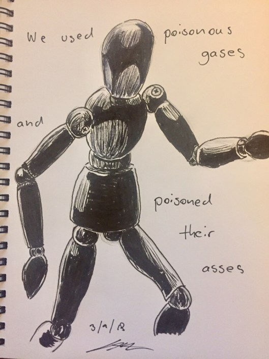 I’m pretty stressed at the moment, but I’m finding drawing quite therapeutic. This one is of a posable figure that I have. It was initially a pencil sketch that I then went over with some Staedtler fibre tip pens.